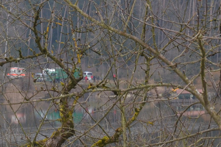 Auf diesem Weiher geschah das Unglück; im Hintergrund die Einsatzfahrzeuge.