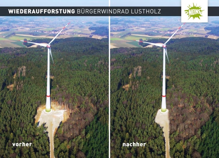 Die für Wege, Kräne und Türme benötigte Nutzwaldfläche beträgt 0,5 Prozent des gesamten zusammenhängenden Waldgebietes. Außerdem erfolgt eine 1:1-Aufforstung vor Ort. An den Windrädern selbst wird ebenfalls das Umfeld wieder renaturiert. Hier als Beispiel eine Simulation zur Wiederaufforstung des bereits bestehenden Bürgerwindrades im Pfaffenhofener Lustholz.