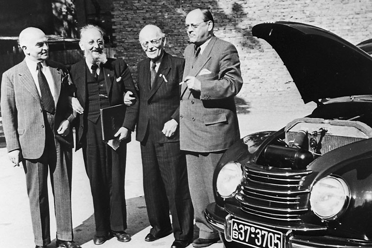 Richard Bruhn (links), August Horch (2. von rechts) und Dr. Hahn (rechts) im Jahr 1950 mit einem DKW F89. Foto: Audi