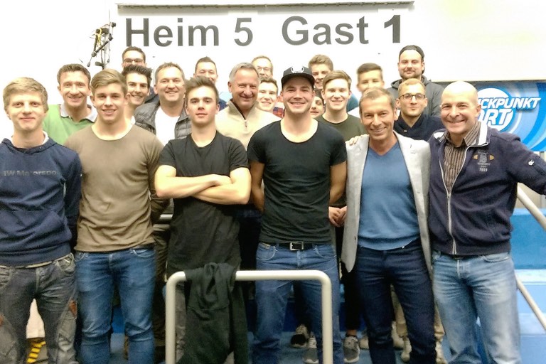 (ty) Auf Initiative des 1. Vorsitzenden Wolfgang Inderwies (vorne rechts im Bild, siehe oben) war eine Delegation des BC Uttenhofen kürzlich als „Fanblock“ in der Fernsehsendung „Blickpunkt Sport“ zu Gast. Der Bayerische Rundfunk hatte dabei sogar den jüngsten 5:1-Heimsieg des BCU in der Dekoration berücksichtigt. Moderator Markus Othmer (Zweiter von rechts) begrüßte die Vereinsvertreter und wünschte weiter beste sportliche Erfolge.