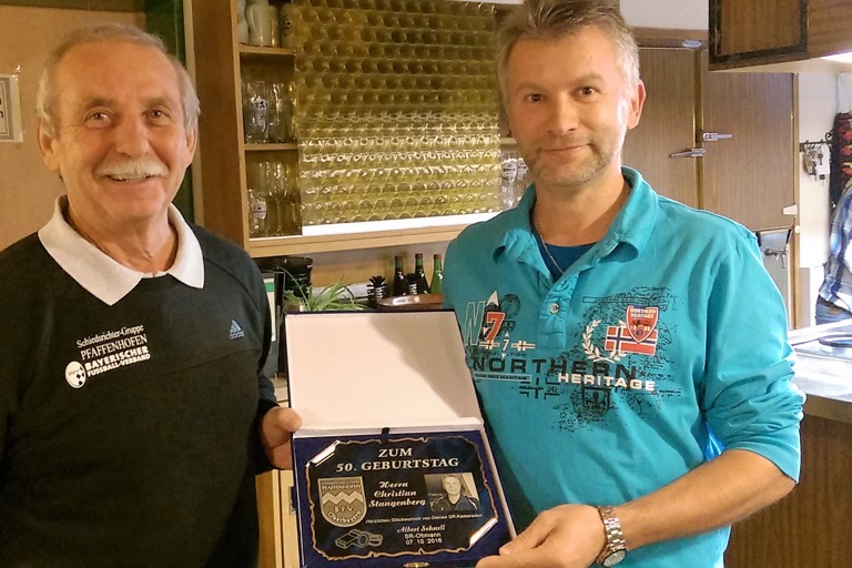 (ty) Zu seinem 50. Geburtstag gratulierte der Obmann der Schiedsrichtergruppe Pfaffenhofen Albert Schnell (links) dem Schiedsrichter-Kameraden Christian Stangenberg (rechts) mit einem Präsent. Der „Stange“ hat seine aktive Schiedsrichter-Karriere nach der aktiven Fußballer-Laufbahn begonnen und ist nun schon seit 13 Jahre regelmäßig im Einsatz, bis vor kurzem auch noch in der Kreisliga. Obmann Albert Schnell wünschte weiterhin guten Pfiff. (Foto: Wolfgang Inderwies)