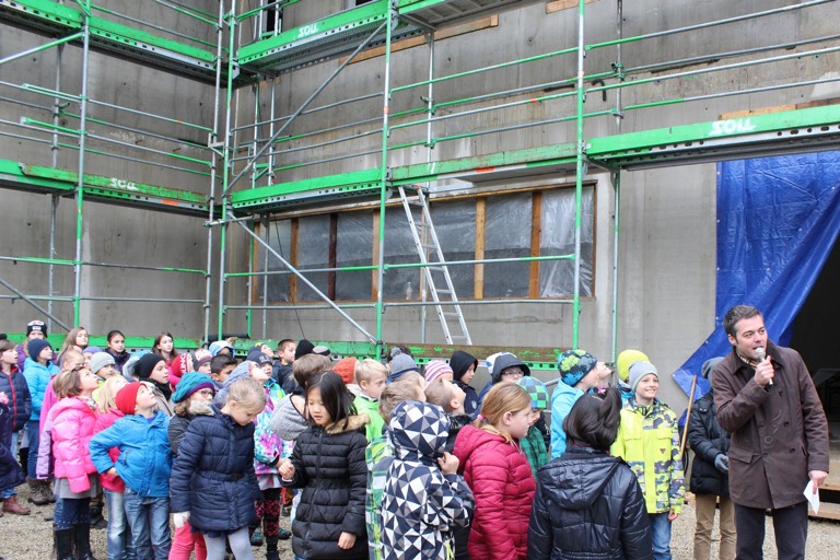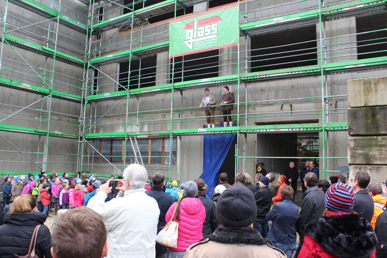 Die Gesamtfläche aller drei Geschosse bezifferte der Architekt Thomas Baron vom Büro Köhler aus Gauting mit 9500 Quadratmetern, „etwa so viel wie in der Allianz-Arena“. Sowohl terminlich als auch handwerklich sei bisher ein gutes Werk erbracht worden, erklärte der Architekt und dankte allen Beteiligten – vor allem Bauleiter Jörg Koch von der Arbeitsgemeinschaft Köhler-Eichenseher und den Mitarbeitern des Bauunternehmens Glass. Auch für die weitere Ausführung zeigte Baron sich optimistisch: „Es wird eine helle, freundliche und lichtdurchflutete Schule“, versprach er, „und obwohl sie sehr kompakt geplant ist, wird sie auch räumlich großzügig.“