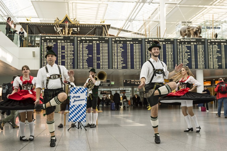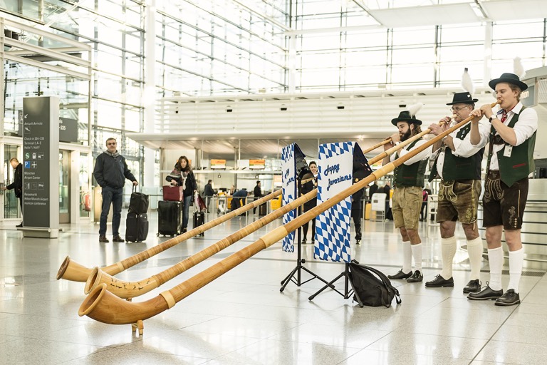 Schuhplattler und Alphornbläser überraschten die Passagiere am Münchner Flughafen zum "World Kindness Day"