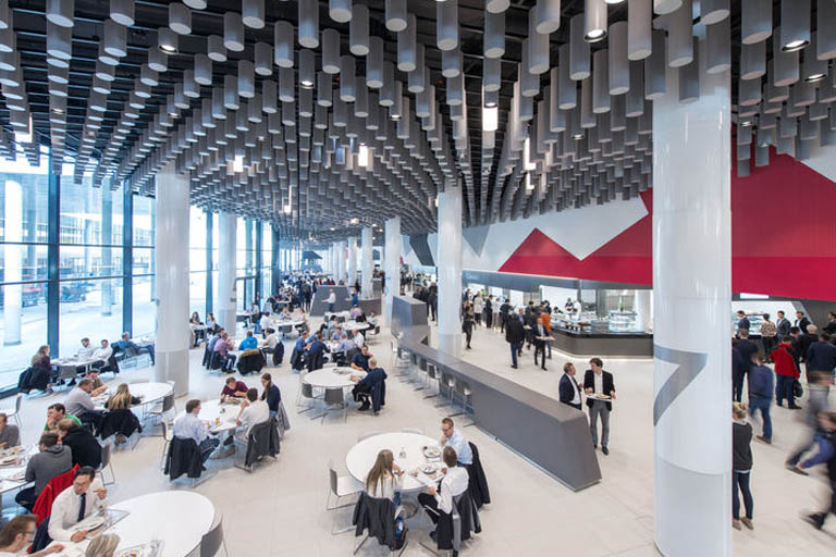 Zusammen mit der Work Lounge ist das Restaurant das Herzstück des neuen Bürogeländes. Die Gastronomie fasst hier aktuell 800 Plätze, in der Endausbaustufe dann maximal 1500 Sitzmöglichkeiten. Unzählige schalldämmende Zylinder an der Decke sorgen für eine gute Akustik. An fünf Countern können die Mitarbeiter zwischen abwechslungsreichen regionalen und internationalen Speisen wählen. Der hintere Teil des Restaurants lässt sich in einen großen Veranstaltungsraum mit Bühne für bis zu 1200 Gäste verwandeln. Und auf der Galerieebene befindet sich die Work Lounge mit einer integrierten Kaffeebar.