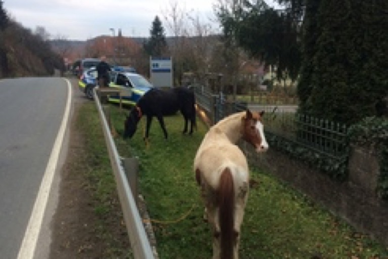 Da Lassos nicht zur polizeilichen Grundausstattung gehören, bastelte der Förster gemeinsam mit den Beamten aus Seilen zwei Halfter und fing die Pferde damit ein. So konnte verhindert werden, dass etwas passierte. Die Pferde konnten inzwischen wohlbehalten wieder an ihre Besitzer übergeben werden.