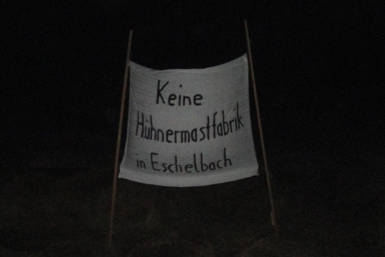 In der besagten Nacht spannten die Aktivisten – ihrer Schilderung zufolge – Banner an der Zufahrt zur Baustelle und an der Staatsstraße 2232. Darauf war zu lesen: „Schluss mit der Ausbeutung von Mensch Tier, Natur“ und „Keine Hühnermastfabrik in Eschelbach“. Die Aktivisten dokumentierten das mit zwei unserer Redaktion übermittelten Fotos.