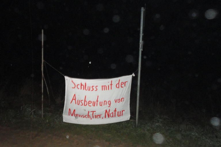 Hintergrund der Aktion sei „der Beginn des Baus einer Tierfabrik, die Anfang des Jahres von der Familie Höckmeier beim Landratsamt Pfaffenhofen nach einem ersten gescheiterten Versuch erneut beantragt worden war“, heißt es in einer am heutigen Samstag veröffentlichten Mitteilung des Aktions-Bündnisses. „Der Vorbescheid, der es dem Mäster erlaubt, bereits Bodenarbeiten zur Vorbereitung der Errichtung der Anlagen vorzunehmen“, lässt nach Ansicht der Aktivisten darauf schließen, „dass die Erteilung der vollständigen Genehmigung kurz bevor steht.“ Auf dem Grundstück „sollen dann in zwei Tierfabriken 144 600 Tiere für den Konzern Wiesenhof gemästet werden“.