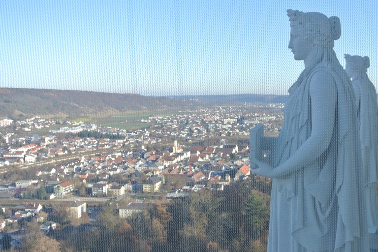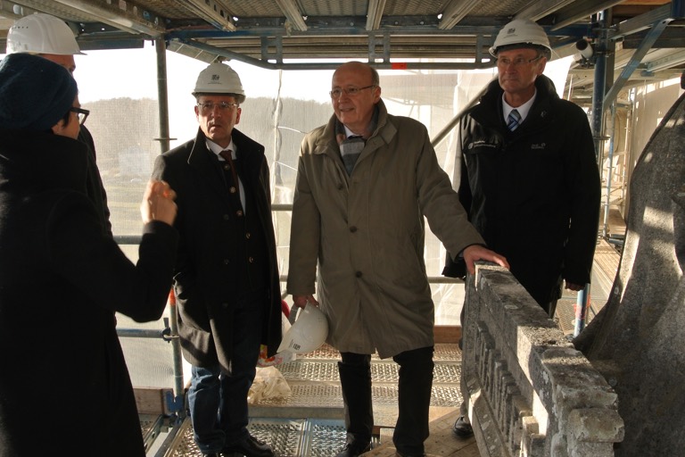 Die Vertreter des Staatlichen Bauamts, Reinhard Piper und Kathy Dörr, erklärten in luftiger Höhe die Arbeitsschritte, in denen die stark verwitterten Siegesgöttinnen renoviert werden, um wieder ihren ursprünglich strahlenden Zustand erhalten. Neumeyer zeigte sich sichtlich beeindruckt von den bereits geleisteten Sanierungsarbeiten. Das Wahrzeichen von Stadt und Kreis Kelheim, das auch ein wichtiger Tourismusmagnet ist, ist derzeit noch etwa zur Hälfte eingerüstet. Der bereits fertiggestellte Abschnitt lässt vermuten, wie künftig die neu „gestrichene“ Befreiungshalle vom Michelsberg erstrahlt.