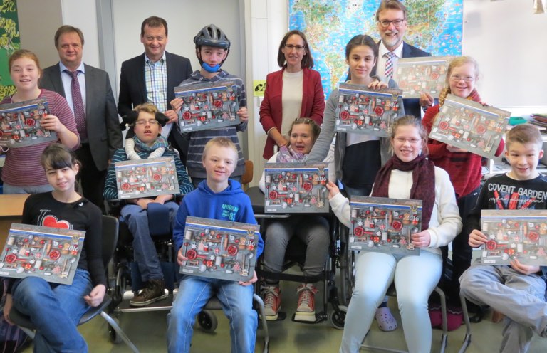 (ty) Über je einen Adventskalender des Lions-Clubs Pfaffenhofen/Hallertau freuten sich die rund 65 Klassen und Gruppen des Heilpädagogischen Zentrums in Pfaffenhofen und Geisenfeld. Landrat Martin Wolf (CSU) überreichte die Kalender gemeinsam mit Vertretern des Fördervereins an die Kinder und Jugendlichen der Adolf-Rebl-Schule. Hinter den 24 Türchen des Kalenders verbergen sich Preise im Wert von über 32 000 Euro. Mit dem Erlös aus dem Verkauf des Adventskalenders wird der Lions-Club hilfsbedürftige Personen, karitative Organisationen oder Projekte in der Region unterstützen.