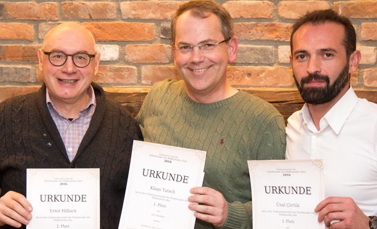 (ty) Im Rahmen ihrer Weihnachtsfeier haben die Pfaffenhofener VHS-Fotofreunde ihre Clubmeister gekürt. Klaus Tutsch heißt der neue Titelträger, der sich mit einem bemerkenswerten Ergebnis von 341 Punkten deutlich vom Rest der Amateurfotografen absetzen konnte. Ein Kopf-an-Kopf-Rennen haben sich dahinter die Mitglieder Ernst Hillisch, Ünal Cörtük und Clemens Fehringer geliefert. Hillisch landete schließlich mit 195 Punkten auf dem zweiten Platz, Cörtük kam mit 190 Zählern auf Rang drei vor Clemens Fehringer (185).
