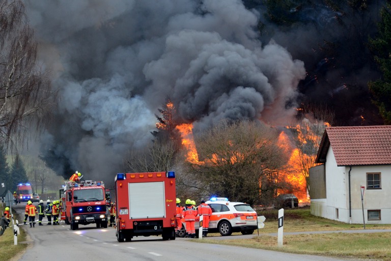 Aus bisher ungeklärter Ursache geriet gestern, gegen 13.55 Uhr, der Stadel an der Kreisstraße PAF 6, in dem eine Maschinenhalle und eine Reparatur-Werkstatt untergebracht waren, in Brand. „Der Firmeninhaber führte gerade Sandstrahlarbeiten in einem an den Stadel angebauten Container durch“, so ein Polizei-Sprecher. „Als er den Container verließ, bemerkte er, dass sowohl der Kompressor, als auch der Dachstuhl lichterloh brannten.“ Der Mann verständigte sofort die Feuerwehr. Als die Floriansjünger ankamen, waren die dunklen, dicken Rauchschwaden bereits von Weitem zu sehen.