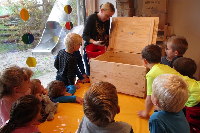 Die Kita Ecolino startete unter dem Titel „Was passiert mit meinem Apfelputz?“ ein mehrschichtiges Projekt aus Sachgesprächen, Spielen, Plakatgestaltungen, Ausflügen und Bau-Aktionen, um den Kindern das Themenfeld Kompostierung und Reststoffverwertung näher zu bringen. „Durch den Klimaschutz-Gutschein konnten die Kosten für einen Komposter, eine „Wurmkiste“, Bücher sowie die Buskosten für kleine Ausflüge weitgehend gedeckt werden“, heißt es dazu aus dem Rathaus.