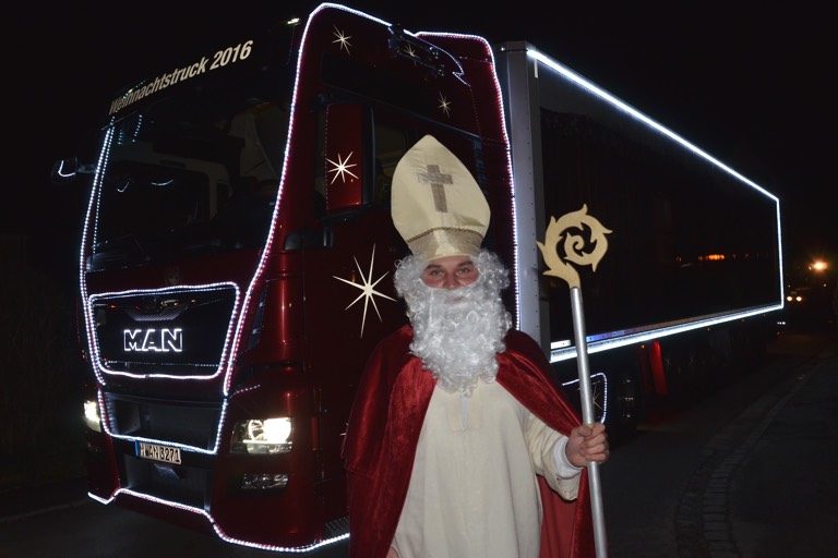 Der MAN-Weihnachtstruck hat heute in der Ortsmitte Station gemacht – Mit an Bord: Der Nikolaus und Geschenke für die Kinder