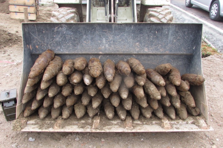 Explosiver Fund. Bei Aushub-Arbeiten im Neubaugebiet nahe der Bahnlinie waren zirka 100 Granaten aus dem Zweiten Weltkrieg entdeckt worden.