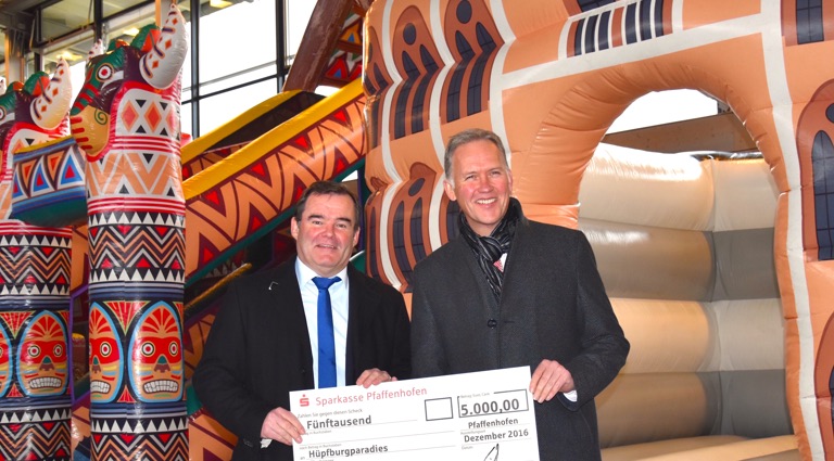 „Nur unter Beteiligung der Sparkasse Pfaffenhofen als großzügiger Sponsor konnte die Stadt dieses besondere Weihnachtsgeschenk erneut auf die Beine stellen, das auch bei den Eltern sehr gut ankommt“, heißt es in einer aktuellen Mitteilung aus dem Rathaus. Der Marktdirektor der hiesigen Sparkasse, Michael Hoyer, überreichte heute bei der Eröffnung des Hüpfburgen-Paradieses einen symbolischen Scheck über 5000 Euro an Vize-Bürgermeister Albert Gürtner (FW).