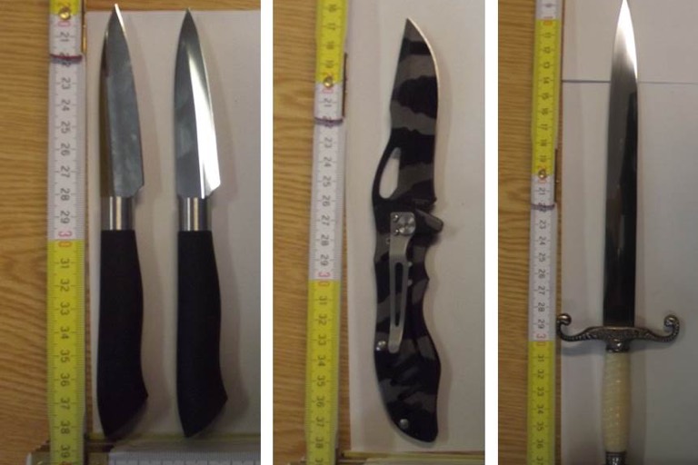 Bei Eintreffen der Beamten leistete der Beschuldigte aus Schwabing erheblichen Widerstand, wie es heißt. „Unter anderem versuchte er gegen die Beamten einen Kopfstoß auszuführen sowie gegen sie zu schlagen und treten“, so ein Sprecher der Bundespolizei. Bei der Durchsuchung des Mannes wurden zwei Küchenmesser mit einer Klingenlänge von je acht Zentimetern, ein Einhandmesser sowie ein Dolch mit 21 Zentimeter Klingenlänge (Foto oben) gefunden. „Die drei Messer trug der Schwabinger griffbereit in seiner Hosentasche, den Dolch führte er in einer Tasche mit“, teilte die Bundespolizei mit.