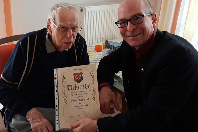 (ty) Eine besondere Ehrung konnte der Vorsitzende des Ball-Club Uttenhofen, Wolfgang Inderwies (rechts im Bild), an das älteste Vereinsmitglied Werner Scheibel (links) überreichen: Für 40-jährige Vereinstreue wurde der 95-Jährige mit der BCU-Ehrennadel in Gold ausgezeichnet. Scheibel war in früheren Jahren in Uttenhofen gesellschaftlich sehr aktiv, der Krieger- und Soldatenverein hatte ihn daher schon vor zwei Jahrzehnten zum Ehrenvorstand ernannt. Im vergangenen Jahr bezog Scheibel ein neues Zimmer im Seniorenheim St. Franziskus in Pfaffenhofen, wo er sich sehr wohl fühlt. Beim Besuch des BCU-Vorsitzenden ergab sich ein angeregtes Gespräch über die Entwicklung des Ortsteils Uttenhofen und seiner Vereine.