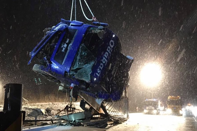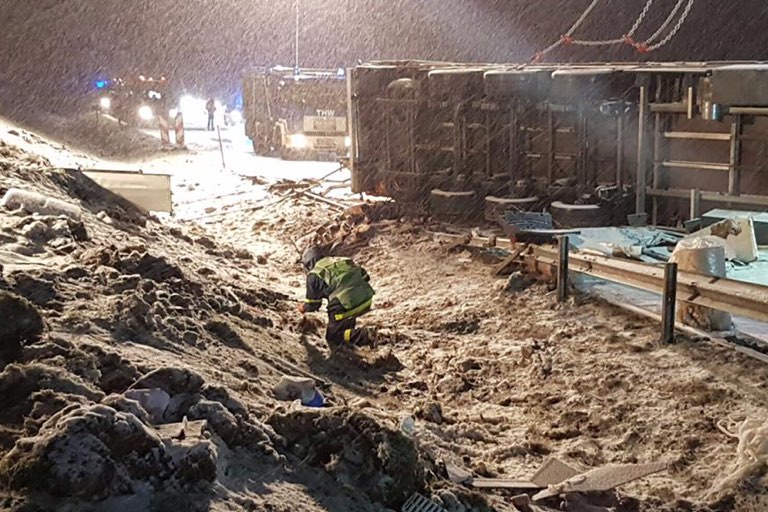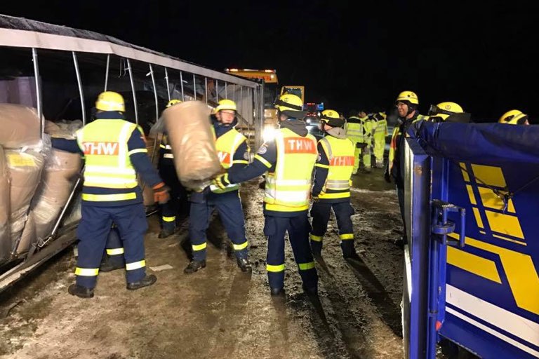 Die Lastwagen-Ladung – nach Angaben des THW unzählige Rollen Dämmwolle und Paletten mit verschiedenen Metallteilen und Pflanzenschutzmittel – musste von den Einsatzkräften aus dem Sattelzug geholt werden, ehe dieser mit Hilfe eines Krans geborgen werden konnte. Das Dachauer THW war dafür im Einsatz und entlud den Laster per Hand. „Im weiteren Einsatzverlauf stellte sich heraus dass der Tank des Lkw beschädigt war, so mussten noch mehrere Kubikmeter Erdreich abgetragen werden“, berichtet das THW. Die Autobahn in Richtung München war während der Bergungsarbeiten zeitweise gesperrt.