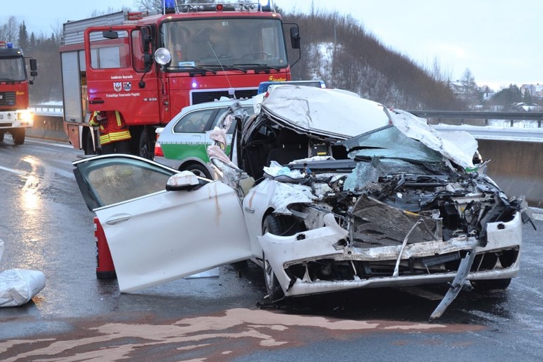 Gegen 15.45 Uhr war der 43 Jahre alte Fahrer aus Mittelfranken mit seinem 5er BMW auf der A9 in Richtung Nürnberg unterwegs. Kurz vor der Ausfahrt Pegnitz verlor er auf der mit Schneematsch bedeckten Fahrbahn die Kontrolle über sein Fahrzeug. Unkontrolliert schleuderte der BMW von der mittleren Spur nach rechts und krachte frontal unter den Auflieger eines polnischen Sattelzugs. Anschließend prallte das Auto nach links in die Betonleitwand und wurde durch die Luft geschleudert. Total beschädigt blieb der BMW dann auf der linken Spur liegen (Foto oben).
