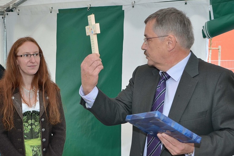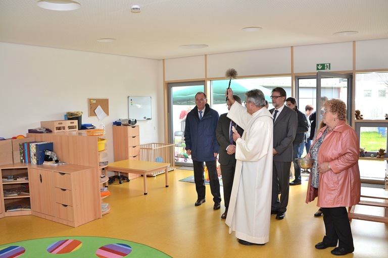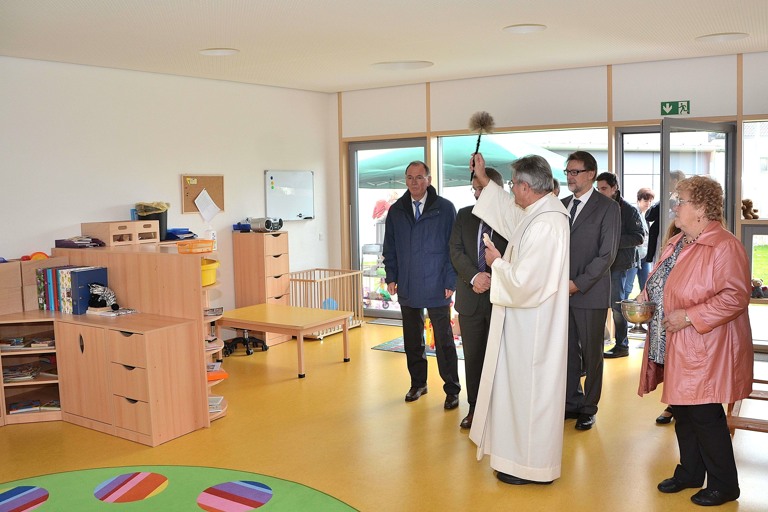 Als richtungsweisend und vorbildhaft bezeichnete auch Pfaffenhofens Landrat Martin Wolf (CSU) das Projekt. Benachbarte Kommunen äugten bereits aufmerksam auf das Schatzkisterl. Zusammen mit dem stellvertretenden Landrat Anton Westner (CSU) und Reichertshofens Bürgermeister Michael Franken (JWU) folgte die Politikerdelegation dann Pater Franz Purainer, der die Räume der Kinderkrippe segnete.