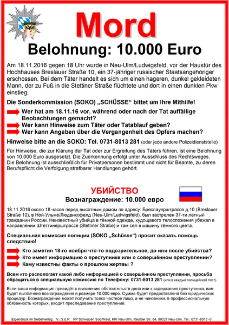 „Unsere Ermittlungen gestalten sich milieubedingt und aufgrund großer Sprachbarrieren äußerst schwierig. Wir erhoffen uns durch die hohe Summe weitere Hinweise. Es kommt auf jeden Ermittlungsansatz an. Die Soko wird deshalb auch weiterhin ständig über unser Hinweistelefon erreichbar sein“, sagt Jürgen Schweizer, Chef der Neu-Ulmer Kripo und gleichzeitig Leiter der Soko. „Wir gehen zur Klärung des Falles jeder Spur und jedem Hinweis nach“ unterstreicht der Kriminalrat. Das Hinweistelefon zur Tat in Breslauer Straße ist rund um die Uhr unter (07 31) 80 13 - 281 zu erreichen. Nachfolgend das Plakat der Polizei: