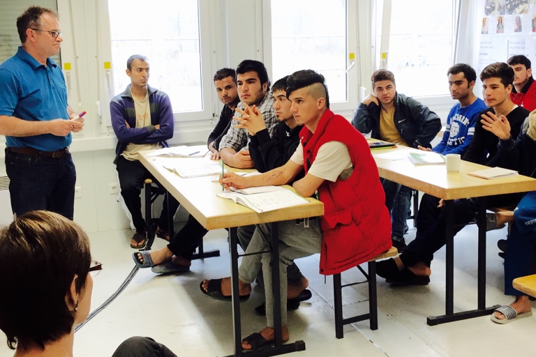 Karl Huber im Gespräch mit Flüchtlingen, die in seiner Gemeinde untergebracht sind.
