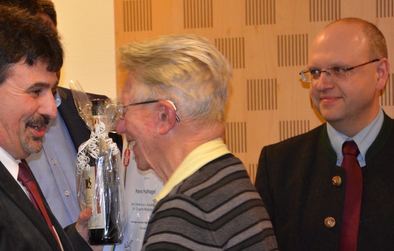 Seit sage und schreibe 70 Jahren Mitglied im Pfaffenhofener Feuerwehr-Verein ist Hans Hufnagel. Vereins-Chef Karl-Heinz Denk (links), Kommandant Roland Seemüller (verdeckt) und Vize-Kommandant Manfred Schweigard dankten ihm für seine Treue.