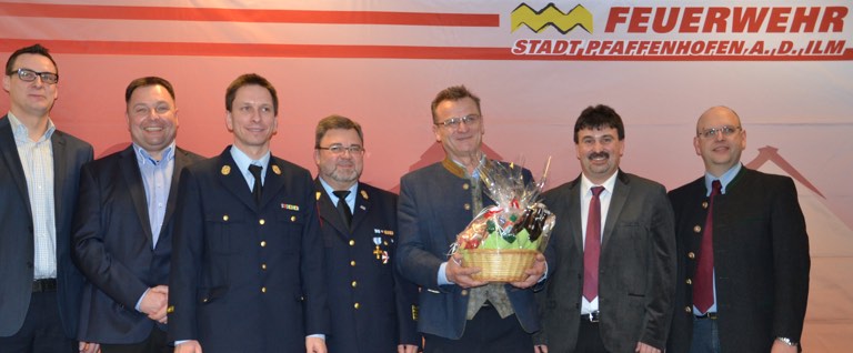 Kreisbrandrat Armin Wiesbeck betonte die Bedeutung der Pfaffenhofener Wehr auch für Einsätze außerhalb des Stadtgebiets und damit für den Landkreis. Grundsätzlich mahnte er jedoch: „Wir müssen schauen, dass wir die Einsatzstärke der Feuerwehren halten können.“ Sein Appell lautet daher auch: „Frauen zur Feuerwehr!“ In einem weiteren Grußwort stellte sich Benedikt Stuber vor, er ist neuer Kreisbrandinspektor. Der 36-Jährige war zuvor Kreisjugendwart und trat nun die Nachfolge von Franz Schwarzer an, der nach 47 Jahren im aktiven Dienst kürzlich in den „Feuerwehr-Ruhestand“ gegangen ist. Schwarzer wurde mit lobenden Worten, einer Auszeichnung, einem Präsent und anerkennendem Applaus verabschiedet.