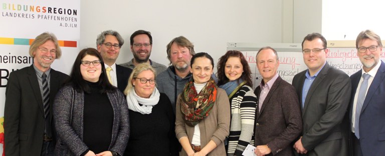 Landrat Martin Wolf (rechts) und die Mitglieder des Strategieforums: Josef Steinberger (Staatliches Schulamt, von links), Theresa Stumpf (Caritas), Florian Habermann (IHK-Akademie Ingolstadt), Renate Benz (Caritas), David Flacke (Landratsamt), Manfred Liesaus (Landratsamt), Galina Römmert-Rühle (Landratsamt), Jessica Biedron (Landratsamt), Peter Sauer (VHS), Gerhard Wenzl (Landratsamt).