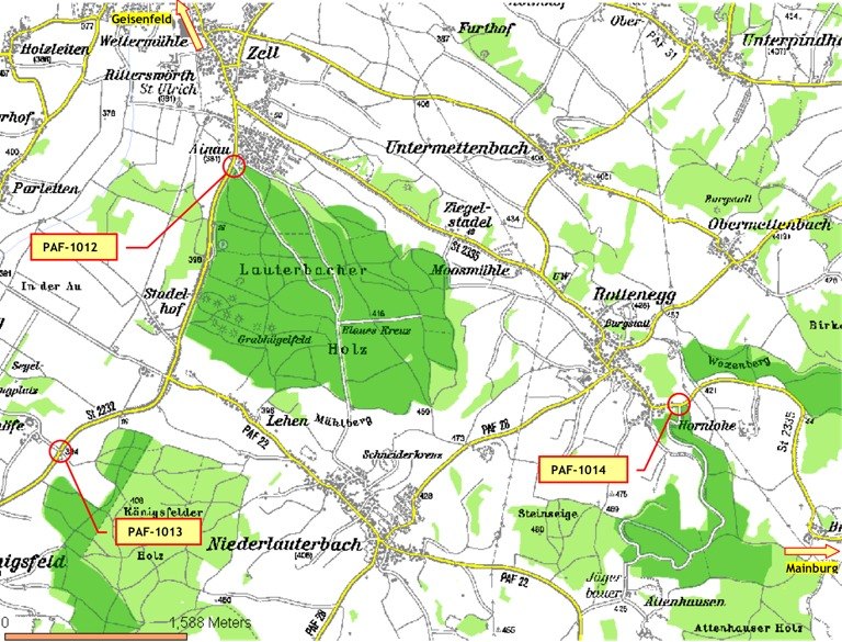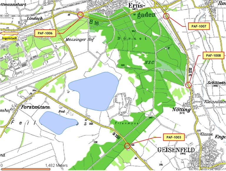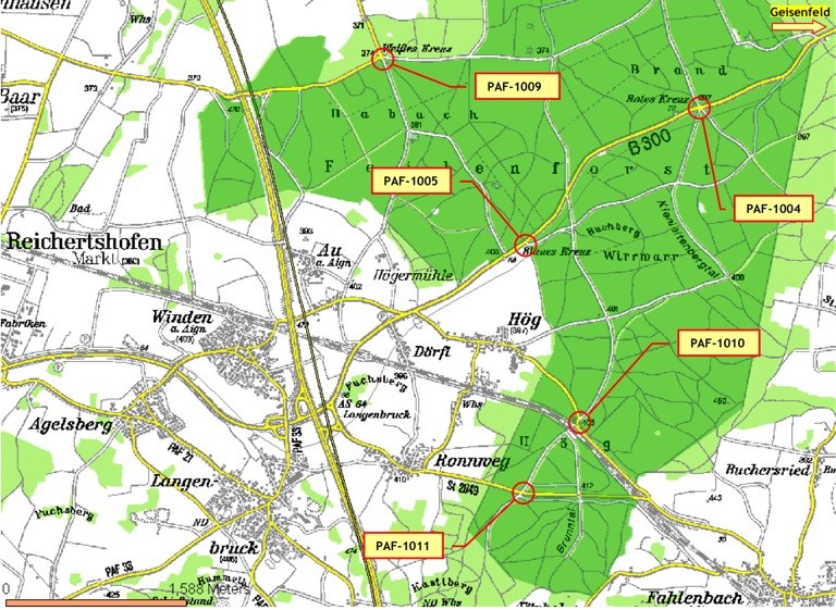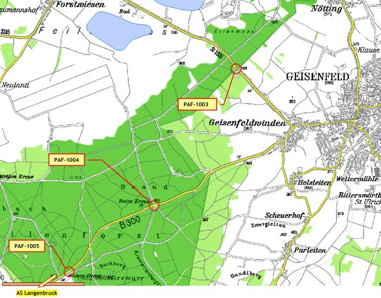 - PAF-1003: St 2335 Geisenfeld – Manching; ca. 1,5 km ab Abzweigung B 300 in Richtung Manching beim Parkplatz im Wald
