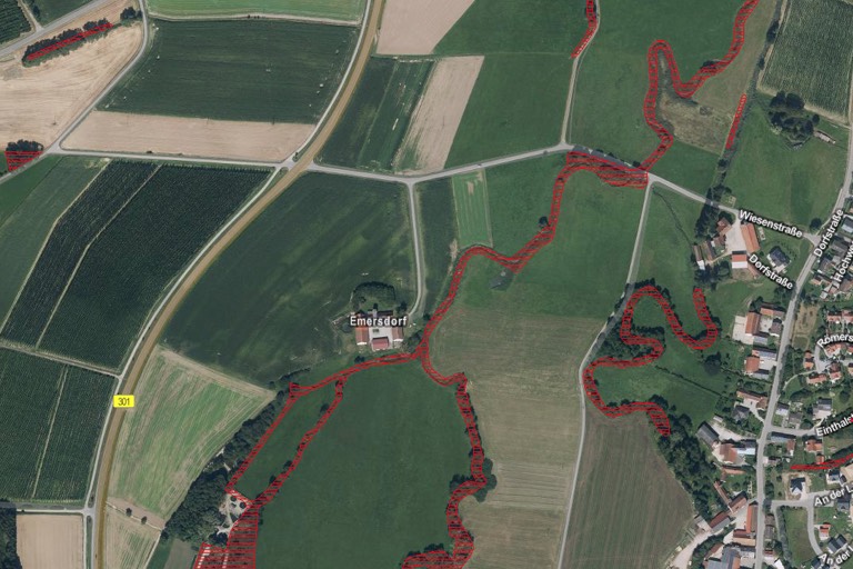 Links oben in der Bildecke das besagte Biotop. Auf der Karte sind sämtliche Biotope rot markiert. (Quelle: BayernAtlas).