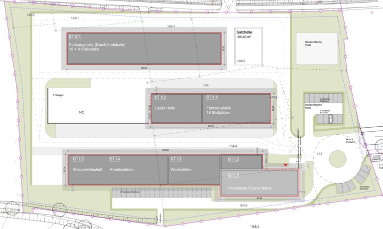 Die Grafik zeigt die Anordnung der Gebäude auf dem Areal des neuen Bauhofs.