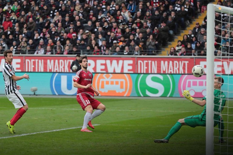 Die beste Gelegenheit zum Ausgleich vergaben die Frankfurter zweifelsohne in der 56. Minute vom Elfmeterpunkt. Der Schiedsrichter hatte ein Foul von Torhüter Martin Hansen gesehen – eine durchaus umstrittene Entscheidung. Und vielleicht war es ausgleichende Gerechtigkeit, dass Hansen den Strafstoß von Makoto Hasebe richtig vorausahnte und parierte – und dass Hasebe zwar zum Nachschuss kam, aber das Leder an die Latte drosch.