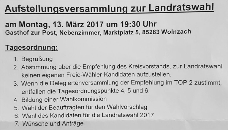 Die Botschaft vom Dezember war kurz und deutlich: „Landrat Martin Wolf ist unserem Vorschlag nach einer Verkürzung der Amtszeit des Landrats auf drei Jahre nachgekommen. Der erweiterte Vorstand der Freien Wähler ist deshalb nach ausführlichen Diskussionen zu dem Ergebnis gekommen, für die Landrats-Wahl 2017 keinen eigenen Kandidaten aufzustellen.“ Die Delegierten-Versammlung – die ja für die Aufstellung oder eben Nicht-Aufstellung eines Kandidaten zuständig ist – werde im Januar über diesen Vorstands-Vorschlag abstimmen, hieß es damals. Doch weder im Januar noch im Februar wurden die Delegierten zusammengerufen.