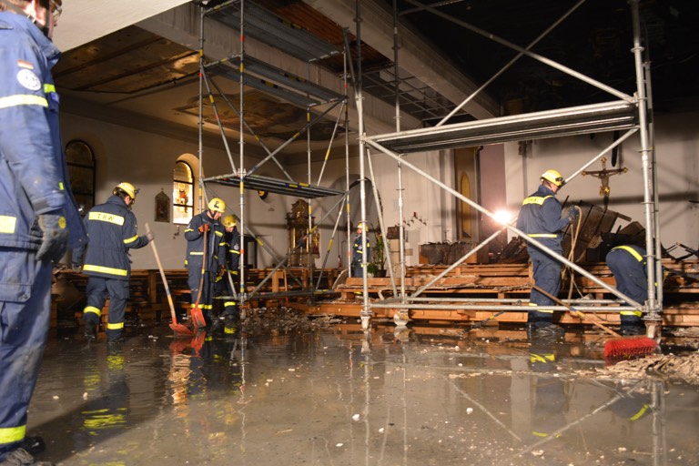 (zel) Nach dem verheerenden Brand in der katholischen Kirche im Altmannsteiner Ortsteil Steinsdorf (Kreis Eichstätt), der am Freitag zahlreiche Feuerwehrleute in Atem gehalten hatte und nach wie vor Rätsel aufgibt, konnten die Experten der Ingolstädter Kriminalpolizei heute mit den Ermittlungen in dem Gotteshaus beginnen. Wie berichtet, war die Brandruine zunächst nicht betretbar. Bis in die Morgenstunden des Samstags waren THW-Kräfte aus Eichstätt und Pfaffenhofen mit Sicherungs-, Abstütz- und Bergungsmaßnahmen beschäftigt; lesen Sie dazu: Retten, was zu retten istAuch waren immer wieder Nachlöscharbeiten nötig.