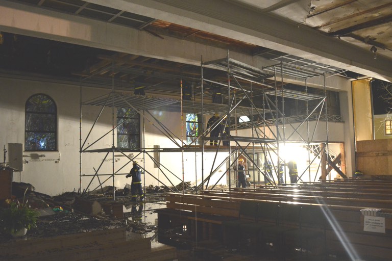 In den Abendstunden musste die komplette Einsatzstelle zudem von mehreren Seiten ausgeleuchtet werden. Dabei kamen ein Lichtmast-Aggregat, Einzelscheinwerfer und Leuchtballons, so genannte Powermoons, zum Einsatz. Die Arbeiten in dem Gotteshaus waren dabei immer wieder zu unterbrechen werden, weil die Feuerwehr zu Nach-Löscharbeiten anrücken musste. Von einem Baulift sowie später von einer erneut alarmierten Drehleiter aus bekämpften die Floriansjünger zahlreiche Glutnester im Dach, die immer wieder zu qualmen begannen.
