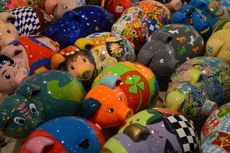 Ein Bild vom Januar vergangenen Jahres, als die Schweine nach dem Abschluss der Kunst-Aktion im Foyer der Pfaffenhofener Sparkasse gesammelt worden waren.