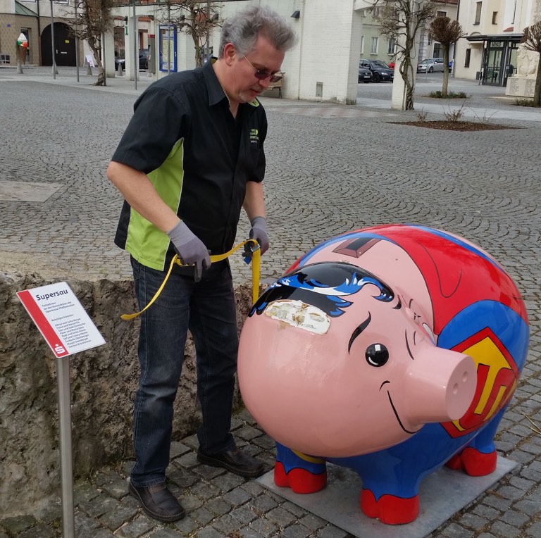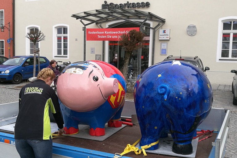 Nicht besser erging es „Cosmic Claire“, die vor der Geschäftsstelle in Münchsmünster aufgestellt worden war. Auch ihr schlugen unbekannte Narren an den Faschingstagen beide Ohren ab. Die Sparkassen-Verantwortlichen bedauern es sehr, „dass die künstlerische Bereicherung des Vohburger Stadtplatzes und des Münchsmünsterer Ortzentrums so kurzlebig war“, wie heute in einer Mitteilung erklärt wird. „Vor allem in Hinblick auf die Arbeitsleistung der Künstler, die viel Herzblut in die Gestaltung der Schweine gesteckt haben, ist das zerstörerische Verhalten mancher unverständlich“, sagt Birgit Distler, die bei dem Geldinstitut für die Kunst-Aktion verantwortlich zeichnete.