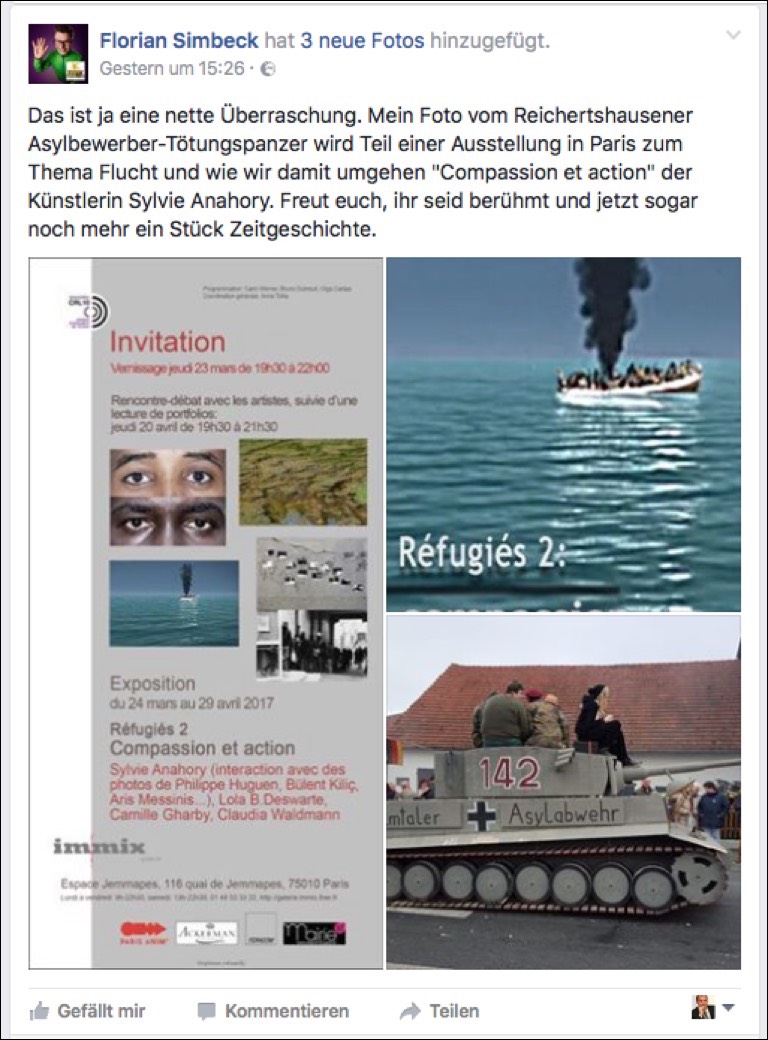 Jetzt, gut ein Jahr später, gibt es erneut Aufregung um einen Facebook-Beitrag von Simbeck. Wieder geht es um den Panzer. „Das ist ja eine nette Überraschung“, postete er gestern. „Mein Foto vom Reichertshausener Asylbewerber-Tötungspanzer wird Teil einer Ausstellung in Paris zum Thema Flucht und wie wir damit umgehen.“ Und offenbar an die Protagonisten von damals gerichtet, fügte er hinzu: „Freut euch, ihr seid berühmt und jetzt sogar noch mehr ein Stück Zeitgeschichte.“
