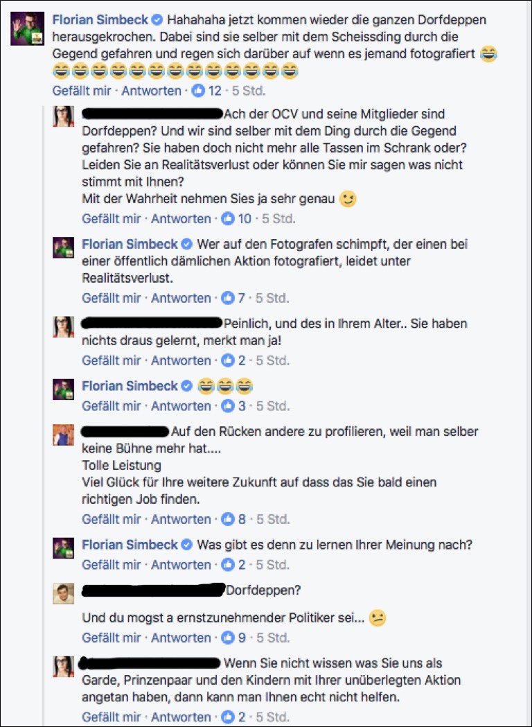 Die Verbal-Attacken an die Adresse von Simbeck ließen nach diesen Zeilen nicht lange auf sich warten. Inzwischen wird schon wieder heiß und kontrovers diskutiert. Auch Simbeck selbst bleibt dran: „Hahahaha“, kommentierte er, „jetzt kommen wieder die ganzen Dorfdeppen herausgekrochen. Dabei sind sie selber mit dem Scheißding durch die Gegend gefahren und regen sich darüber auf, wenn es jemand fotografiert.“ Wer auf den Fotografen schimpfe, der einen bei einer öffentlich dämlichen Aktion fotografiere, leide unter Realitätsverlust. Und: „Wer mit was auch immer in einem Faschingsumzug durch die Gegend fährt, muss damit rechnen, dass er damit auch fotografiert wird und kann am Ende die Verantwortung für die öffentliche Wahrnehmung nicht dem Fotografen in die Schuhe schieben.“