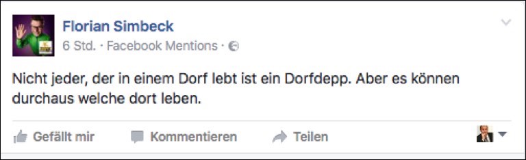 Simbeck selbst wollte heute auf Anfrage unserer Zeitung den ganzen Wirbel und die Einlassungen von Flössler & Co. eigentlich gar nicht kommentieren. „Ich schulde der JU keine Erklärung“, sagt er nur. Zudem sei es ja jedem selbst überlassen, ob er sich als „Dorfdepp“ angesprochen fühle. Auf Facebook stellte er noch klar: „Nicht jeder, der in einem Dorf lebt, ist ein Dorfdepp. Aber es können durchaus welche dort leben.“