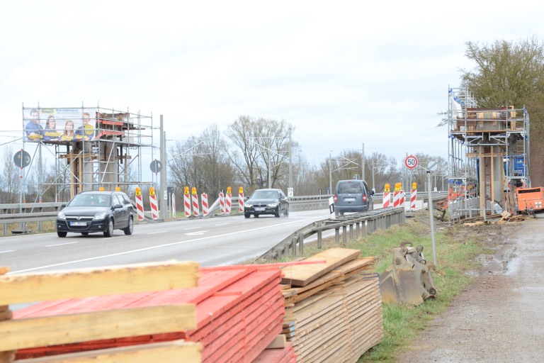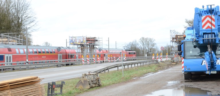 Staatsstraße 2232 ab 18 Uhr für den Verkehr gesperrt – Kran hebt Teile des neuen Überbaus ein, Fahrplan-Änderungen beim Zugverkehr – Brücke soll bis zum Sommer fertig sein