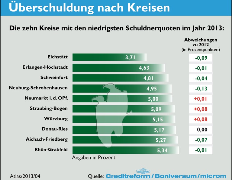 (ty/zel) Der Landkreis Eichstätt zählt bundesweit betrachtet die wenigsten überschuldeten Bürger im Verhältnis zur Einwohnerzahl. Die Quote beträgt dort gerade einmal 3,71 Prozent. Das geht aus dem Schuldneratlas 2013 hervor, der von der Wirtschaftsauskunftei Creditreform veröffentlicht wurde. In Ingolstadt liegt die Quote demnach bei 7,27 Prozent, im Kreis Pfaffenhofen bei 6,22 Prozent. Im Kreis Kelheim Schrobenhausen sind 6,66 Prozent der Bürger überschuldet. In Neuburg-Schrobenhausen sind es nur 4,95 Prozent – der bundesweit vierniedrigste Wert, gefolgt von Neumarkt in der Oberpfalz (5,00 Prozent) auf Rang fünf. Auf Rang neun der Liste mit den niedrigsten Schuldnerqouten liegt Aichach-Friedberg (5,27 Prozent).