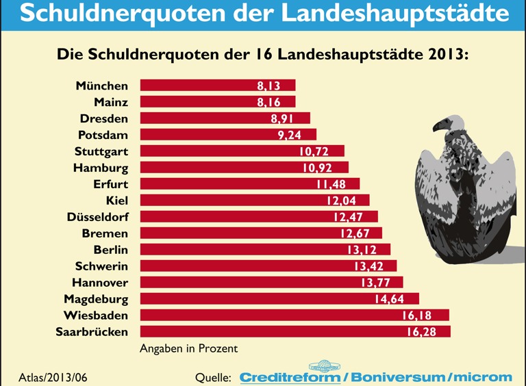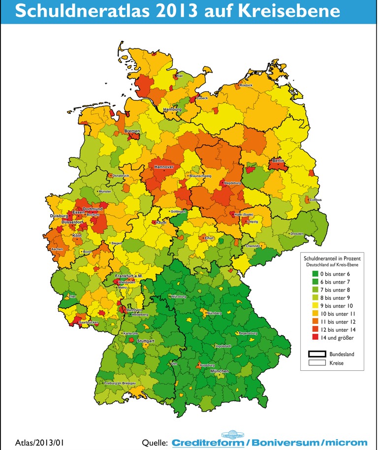 Die Erhöhung der Quote kommt den Angaben zufolge durch die Revision der Einwohnerzahlen in Deutschland zustande: Das Statistische Bundesamt erkannte auf der Basis eines neuen Zensus, dass Deutschland tatsächlich weniger Einwohner zählt, als bisher angenommen. Die aktuelle Quote der Schuldner von 9,81 Prozent errechnet sich auf der Basis von 67,13 Millionen volljährigen Erwachsenen. „3,33 Millionen Haushalte sind überschuldet und nachhaltig zahlungsgestört“, heißt es. Das durchschnittliche Schuldenvolumen in Deutschland betragte 33 500 Euro (Vorjahr: 33 700).