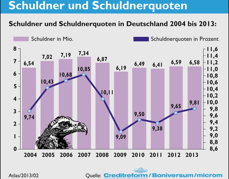 Fast jeder zehnte Deutsche ist überschuldet. Das ist das zentrale Ergebnis aus dem Schuldneratlas 2013. Im Oktober zählte Deutschland demnach 6,58 Millionen überschuldete Privatpersonen. Im Vorjahr lag die Zahl geringfügig höher (6,59 Millionen). Die Schuldnerquote betrug im Vorjahr 9,65 Prozent, jetzt sind es 9,81