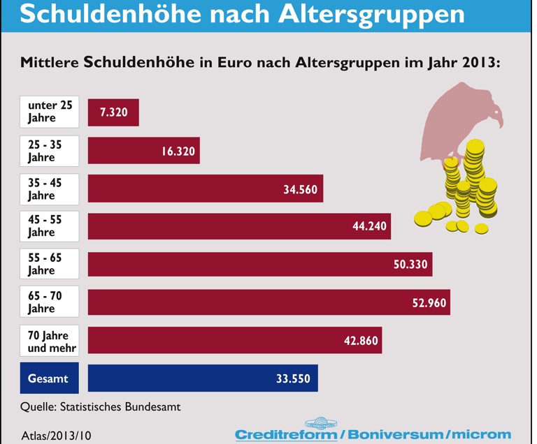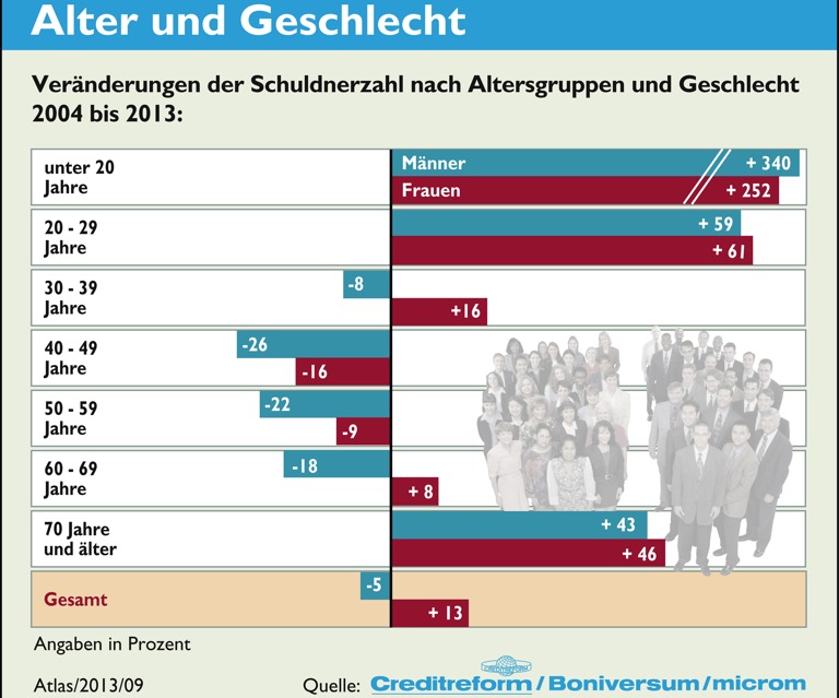 Aktuell ist den Angaben zufolge die Zahl jugendlicher Schuldner unter 20 Jahren zwar von 216 000 Fällen (2012) auf jetzt 213 000 zurückgegangen, seit 2004 hat diese Altersgruppe jedoch mit einer Zunahme von bemerkenswerten 302 Prozent von 53 000 (2004) auf den aktuellen Wert von 213 000 am stärksten zugenommen. Eine markante Steigerung um 59,9 Prozent auf 1 581 000 Schuldner weist auch die nächste Altersgruppe der Twens zwischen 20 und 29 Jahren aus. Wenn auch auf deutlich geringerem Niveau absoluter Zahlen, stimme doch auch die Steigerung in den Jahren 2004 bis 2013 bei den Über-70-jährigen Betroffenen von 42,3 Prozent auf aktuell 111 000 überschuldeter Privatpersonen bedenklich.