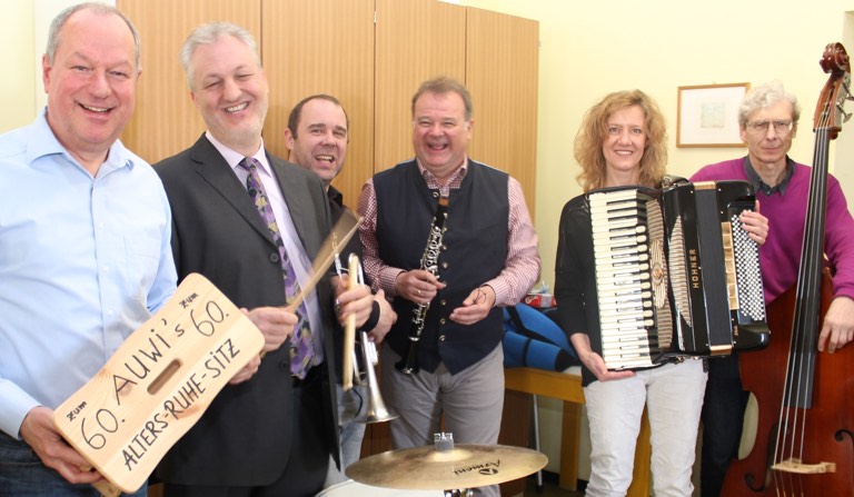 Zum 60. Geburtstag freute sich Musikschulleiter Auwi Geyer (von links) über einen hölzernen „Alters-Ruhesitz“ und die Musik seiner Kollegen Arno Haselsteiner, Reinhard Greiner, Max Penger, Helga Widmann und Günther Hausner.