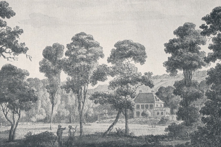 Goethes Gartenhaus an der Ilm zu Weimar; Ausschnitt aus einer Zeichnung von Georg Melchior Kraus aus dem Jahr 1777.