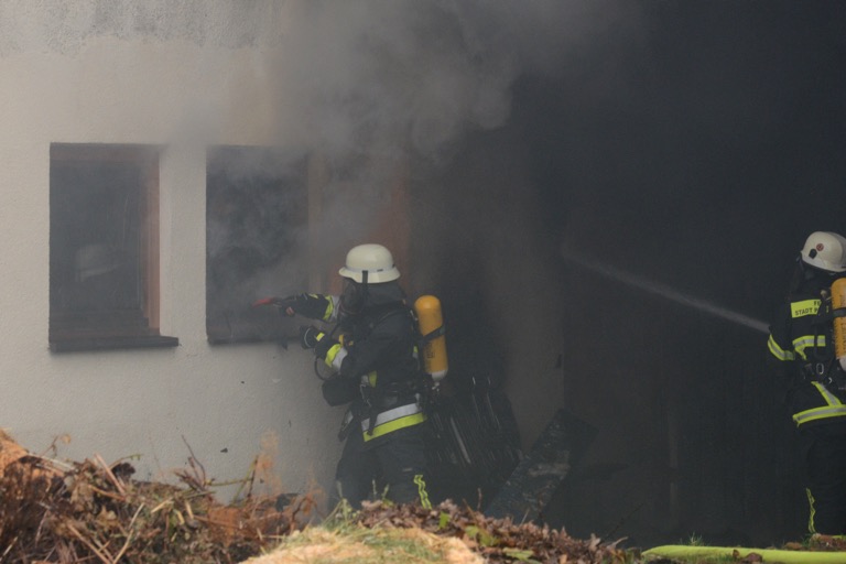 Alarmiert worden waren die Einsatzkräfte gegen 18.30 Uhr – wegen einer brennenden Gartenhütte, wie es ursprünglich hieß. Als die ersten Floriansjünger eintrafen, war aber schnell klar, dass hier ein großes landwirtschaftliches Gebäude abzubrennen droht. Laut Seemüller stand ein Teil des Bauwerks bereits in Vollbrand, das Feuer hatte zudem nach oben übergegriffen. Weitere Feuerwehrleute wurden deshalb schnell nachalarmiert – nicht zuletzt deshalb, weil sich auch ein höherer Bedarf an Atemschutzgeräte-Trägern abzeichnete.