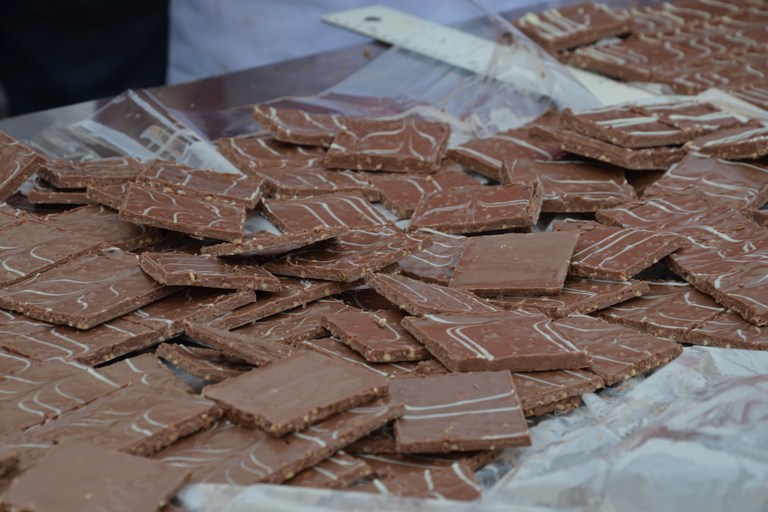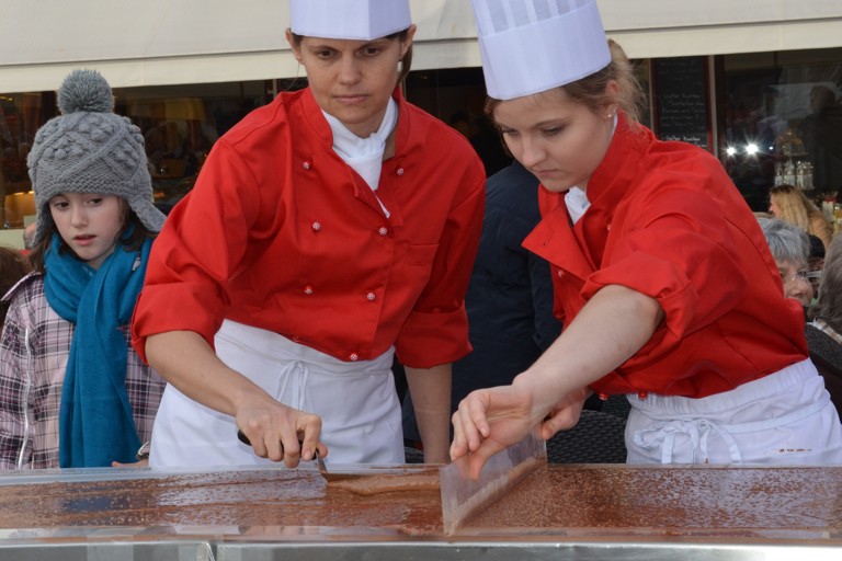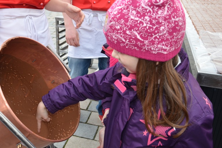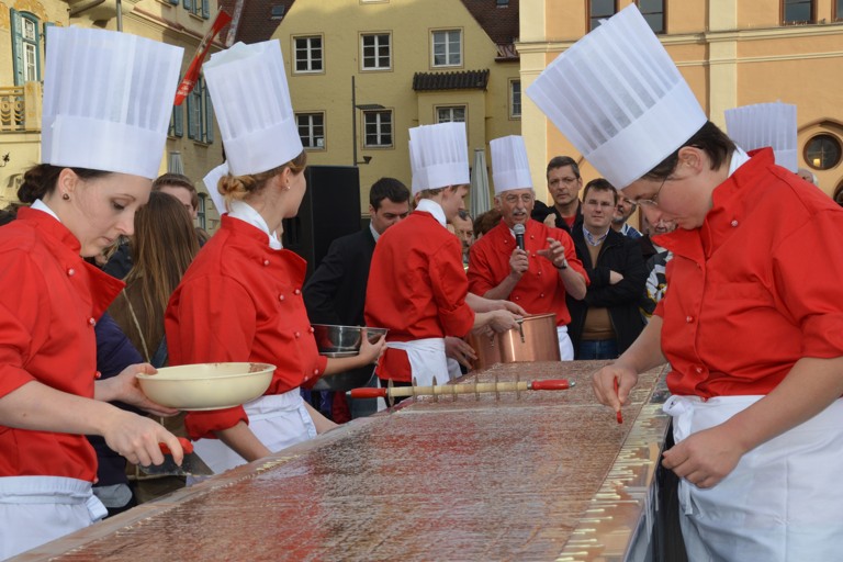 Es war ein Menschenauflauf auf dem Hauptplatz, der es einem schwer machte, überhaupt einen Blick zu ergattern auf die Protagonisten, die da in roten Jacken, weißen Schürzen, weißen Halstüchern und mit weißen Mützen nur so herumwuselten. Die einen schafften in großen, kupferfarbenen Bottichen literweise die Schokoladenmasse heran, andere rührten, strichen glatt, verzierten oder schnitten mit einem speziellen Werkzeug die späteren Sollbruchstellen in die sich nach und nach, Meter für Meter verlängernde XXXXL-Schokoladentafel.